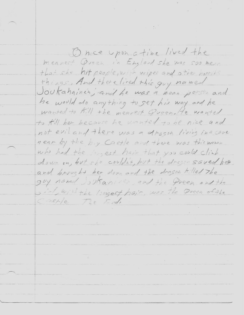 Once upon a time lived the meanest queen in England she was so mean that she hit people with wipes and other horrible things and there lived this guy Joukanaien, and eh was a mean person and wanted to kill the meanest queen. He wanted to kil her because he wanted to be nice and not evil and there was a dragon living in a cave near by the big castle and there was this women who had the longest hair that you could climb down on, but she couldn’t, but the dragon saved her and brought her down and the dragon killed the guy name Joukahienen and the Queen and the girl with the longest hair was the queen of the castle. The end.