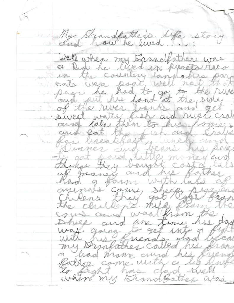 Well when my grandfather was a kid he lived in Puerto Rico in the country land. His parents were poor well not that poor he had to go to the river and put his hand at the side of the river banks and get sweet water fish and river crabs and take them to his home and eat for breakfast, lunch and dinner and beans. His parents got paid little money and things they bought cost tons of money and his father had a farm with lots of animals cows, sheep, pigs and chickens they got eggs from the childrens milk from the sheep and one time his dad was going to get into a fight with his friends dad because my grandfather called his friend a bad name and his friends father came with a big knife to fight his dad well when my grandfather was a kid he couldn’t get shows until he was 10 and then he came to California in 1953 to be a city worker for Bell Gardens and then he met this women who is my grandmother now, she had my mom and she got older and had me and she had a girl we moved with my grandfather and we were still living with my grandfather. The End.