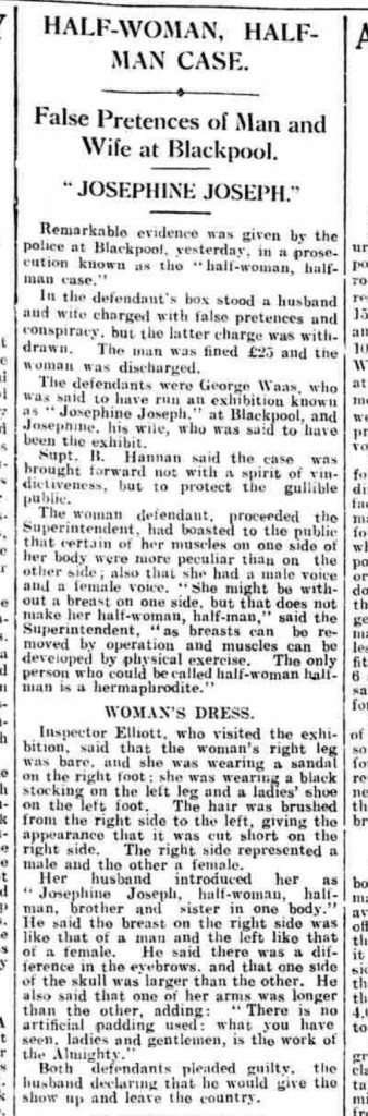 In 1930, Joseph and her husband George Waas, described only as an American couple in newspapers, were presenting a Coney Island style attraction in Blackpool, England under the title of “Josephine Joseph”, were prosecuted in the UK for false pretenses and conspiracy on account of their “Half-Women/Half Man” circus show.