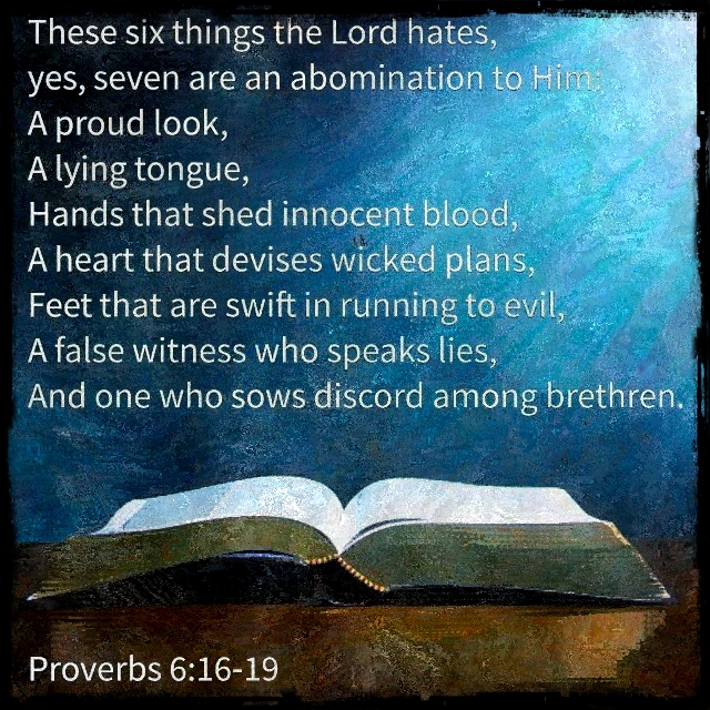 These 7 things the Lord Hates and I do everything in my power to say clear of what GOD hates, again I am not perfect and we all fall short in the glory of GOD, but he gives us specific standards to follow.