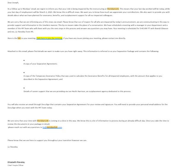 Immediately feeling the pit of stomach that in a way was not surprising as other companies, especially in tech, were going through mass layoffs and this was our time, despite the company telling us quarter after quarter that we are in great shape, especially since the company went public. I immediately woke up my wife, although I contemplated showing her, giving her a few more hours of peace but needed to share it with her, obviously she was saddened, worried, seeing how it immediately affected. I genuinely like my role despite the year prior getting a new manager and finding her to someone who cared nothing for me as her employee and went out of her way to make life difficult for me, a person I shall never forget.